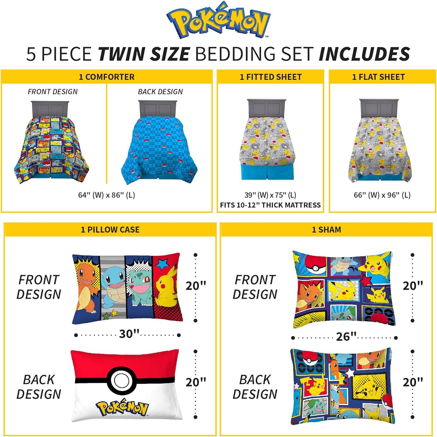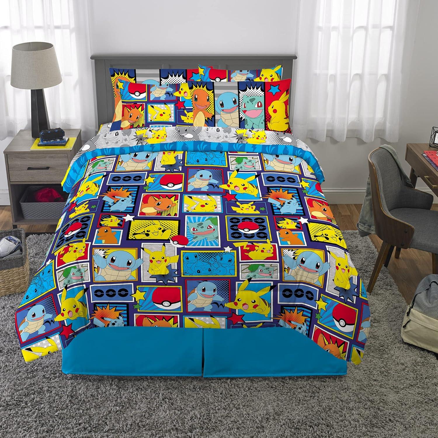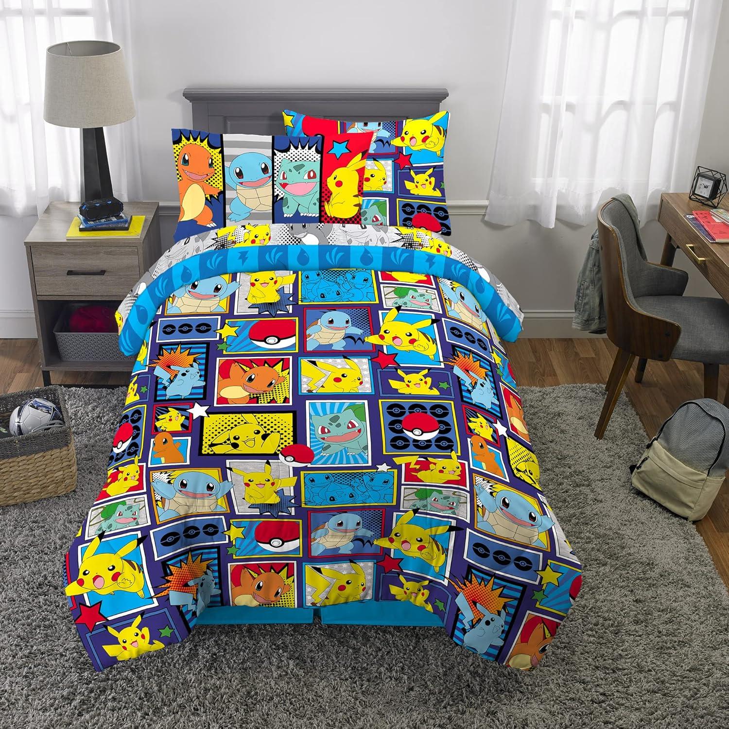 POKEMON DESIGN: Give him a bedroom worthy of a Pokemon trainer with a bedding set featuring the popular Pikachu, and crew Fun pops of primary colors stand out against versatile shades of blue and grey for an action-packed look kids love.