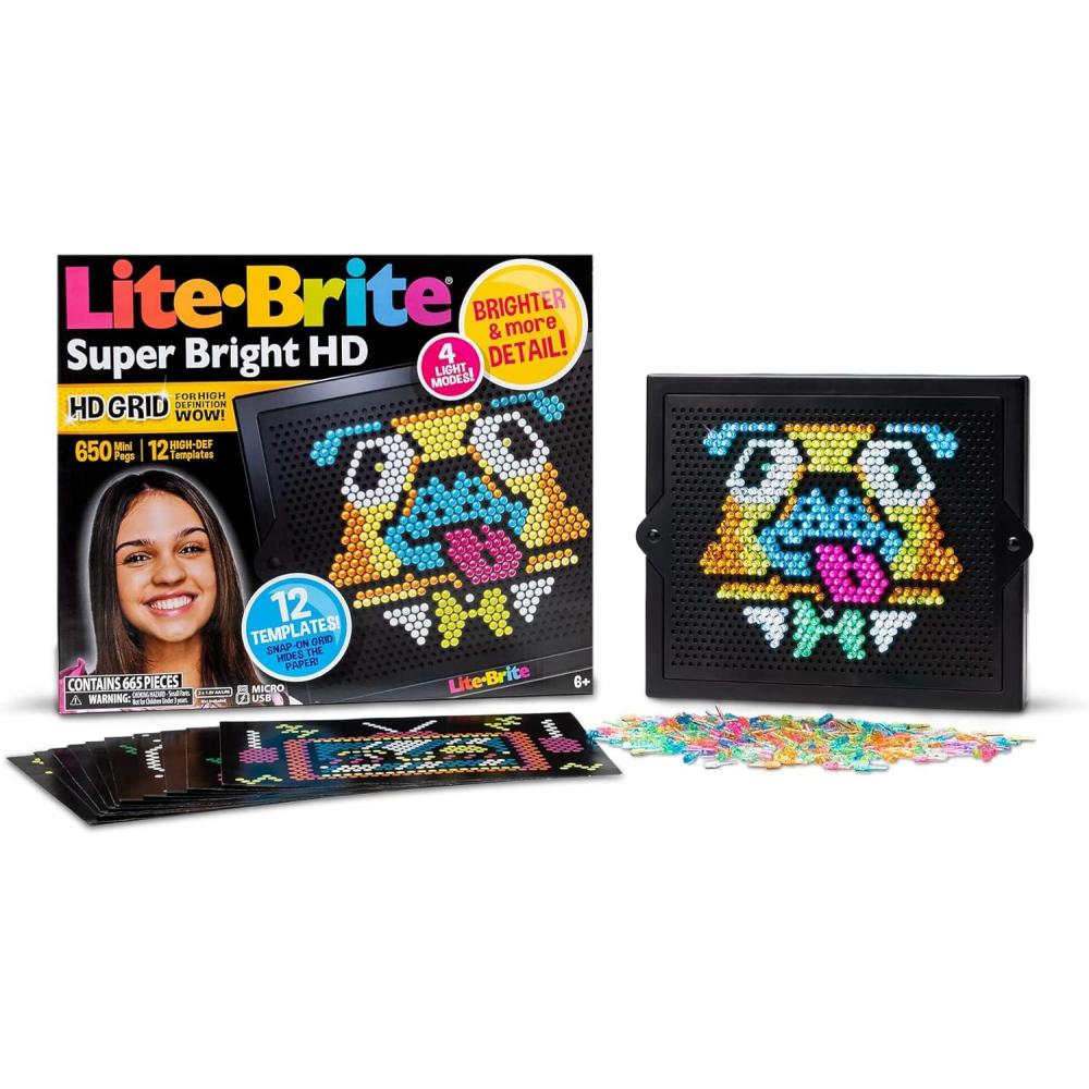 Unleash your inner Pokémon Trainer to light up your creativity with the Lite-Brite Super Bright HD, Pokemon Edition! Based on the retro toy you love, this classic has level-uped to bring to life POKEMON in a whole new way. Featuring a brighter display with double the LEDs and higher definition, this Lite-Brite edition provides more details to your design. Use one of the 6 HD Pokemon design templates or let your creativity shine as you design your own art! BRIGHTER & MORE DETAILS! This high-definition light grid is brighter and better than ever with double the LEDs and double the definition! 6 HIGH-DEF POKEMON TEMPLATES There are 6 HD templates to build, including eye-popping designs like Pikachu Charged, Great Ball, and Poke Ball! SNAP-ON GRID Place template under the grid vs on top so your art can shine bright! 1,000 MINI PEGS Includes 1,000 colorful mini-pegs you can use to bring Pokemon to life! 4 Light MODES & USB PORT Light up your art with 4 different light modes – steady light, bounce, flash and clockwise. If you want to keep the light on continuously, simply hold the Power Button for 5 seconds. USB port (cable not included).