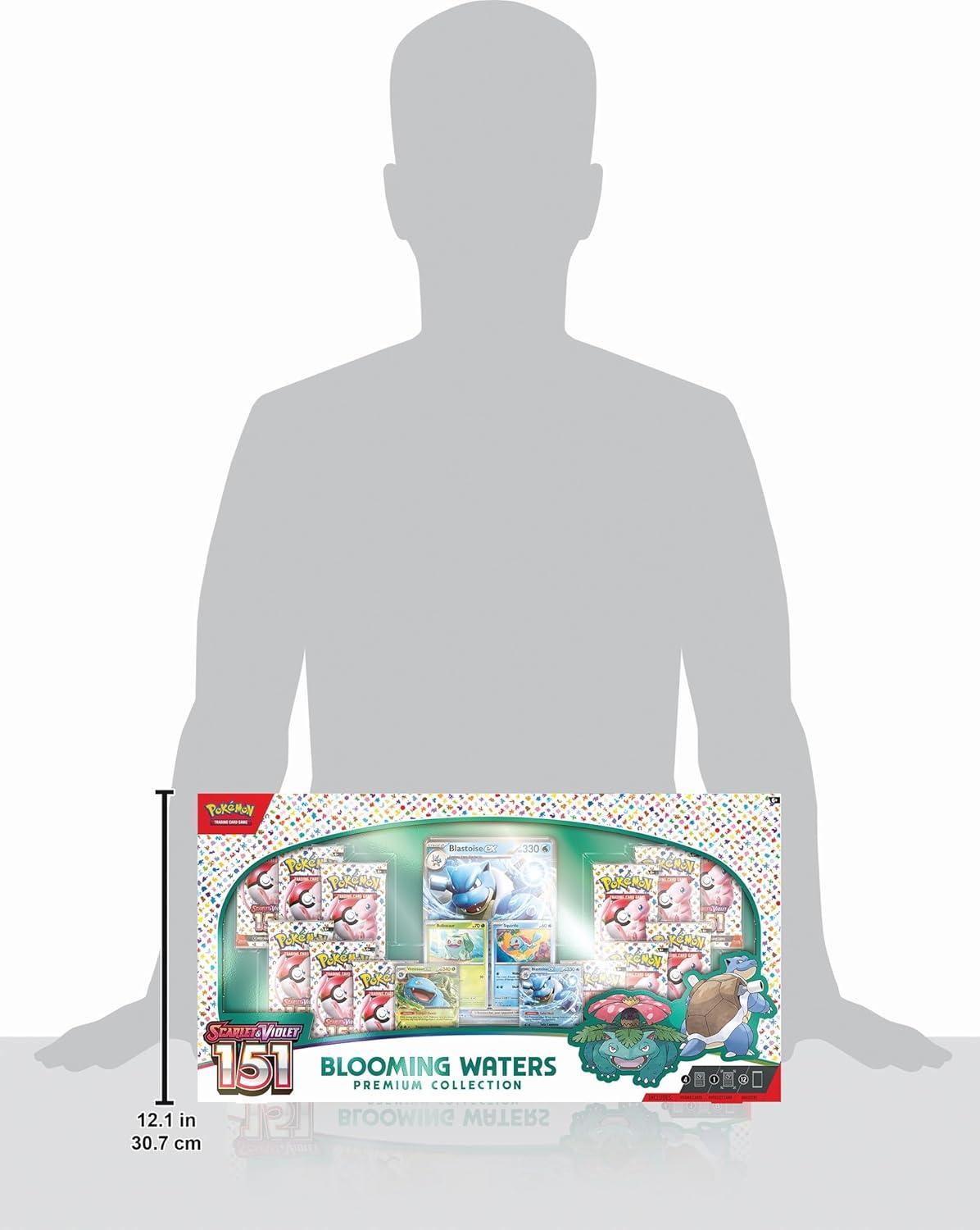 The Pokémon TCG: Blooming Waters Premium Collection includes 4 foil cards featuring Venusaur ex, Blastoise ex, Bulbasaur, and Squirtle.