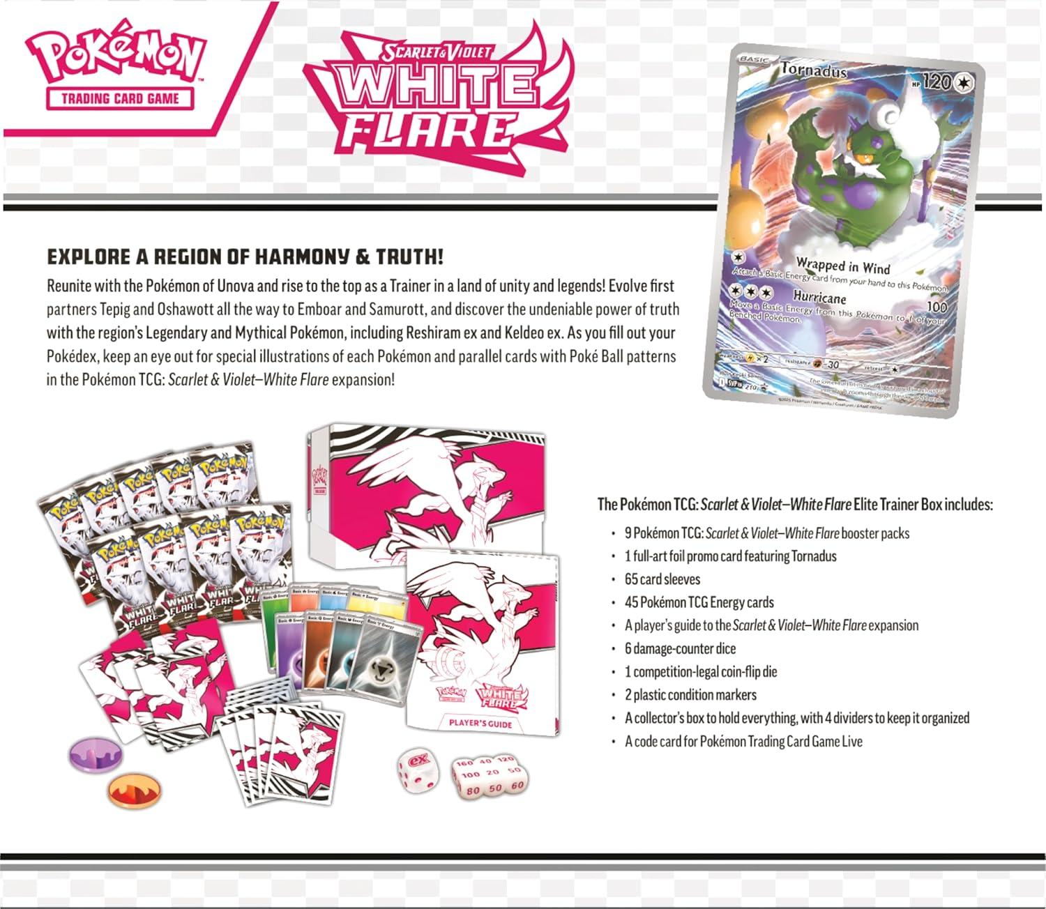 The Pokémon TCG: Scarlet & Violet—White Flare Elite Trainer Box includes 9 Pokémon TCG: Scarlet & Violet—White Flare booster packs and 1 full-art foil promo card featuring Tornadus.