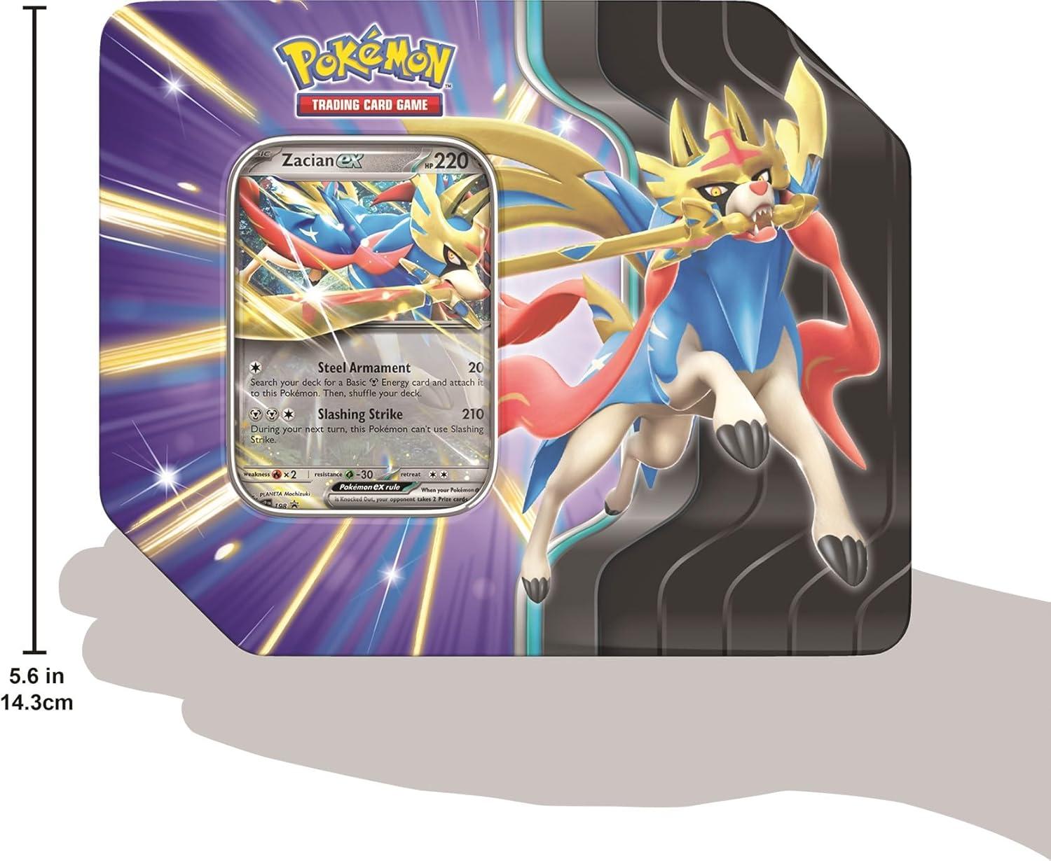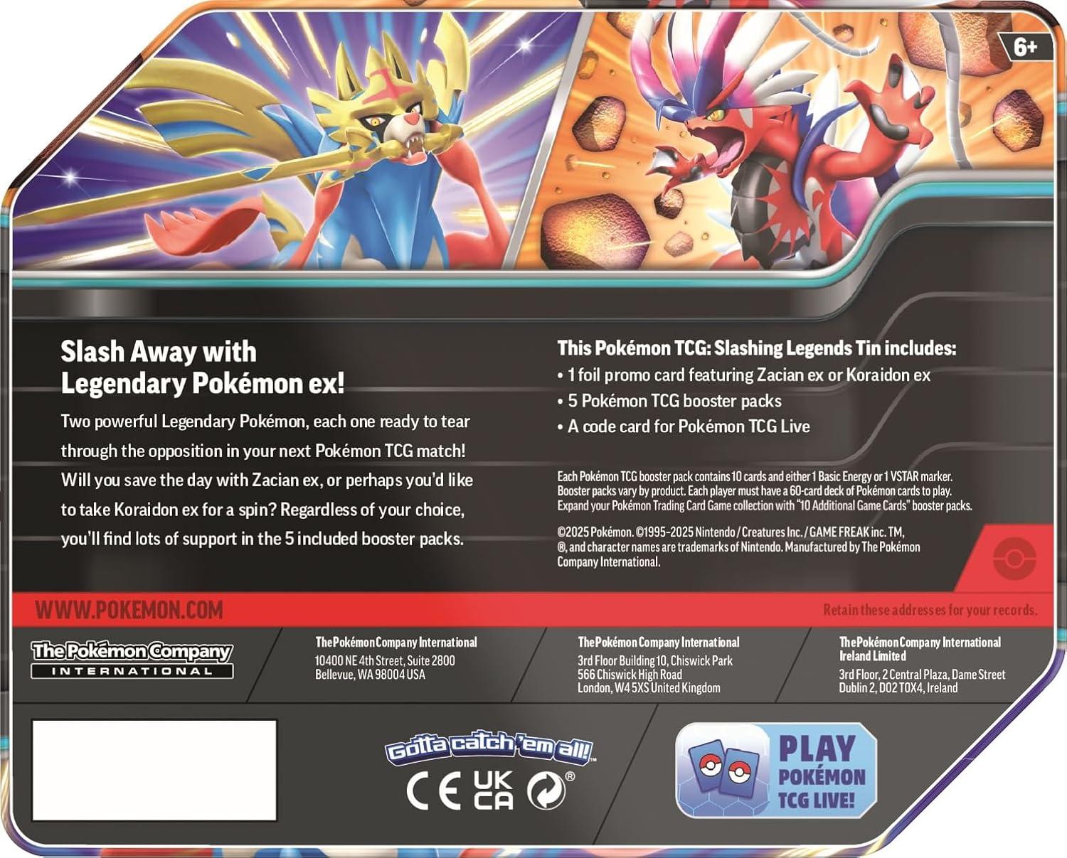 The Pokémon TCG: Slashing Legends Tin includes 1 foil promo card featuring Zacian ex or Koraidon ex.